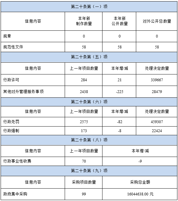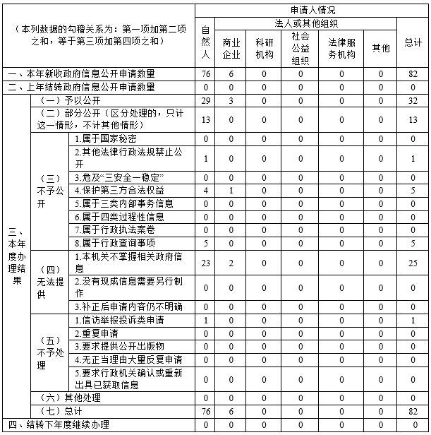 ?。ǘ┲鲃庸_政府信息統(tǒng)計口徑說明。第一項總體情況匯報的主動公開政府信息數(shù)主要統(tǒng)計各單位公布在市政府網(wǎng)站政府信息公開目錄里的政府信息數(shù),第二項主動公開政府信息情況表格里的“行政許可、其他對外管理服務事項、行政處罰、行政強制”等數(shù)據(jù)主要統(tǒng)計各單位公開的權(quán)責清單相關事項總數(shù)。